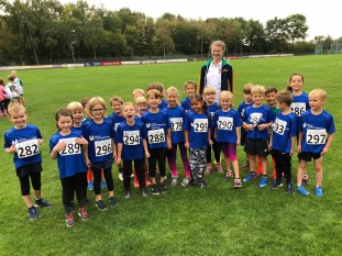 Foto: die 22 U8-Kids des RLC mit Trainerin Sophia Hesse, die ihre neuen Trikots der Öffentlichkeit im Rahmen des Kinderleichtathletik-Wettkampfes in Herten präsentieren durften.