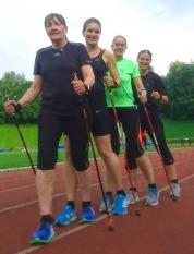 Foto: privat / die vier RLC-lerinnen Marie Cegla, Dr. Antje Maas, Sabine Löseke und Gabi Ott auf den letzten Trainingsmetern vor den Off. Deutschen Nordic-Walking-Meisterschaften.